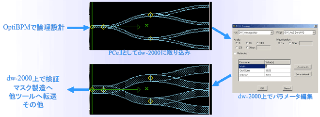 また配置したエレメント/セルはdw-2000の変換機能を用いてGDSII形式のストリームデータに落とすことが可能(オプションによりMEBESやJEOL形式への変換も可能です)。これにより他CADへ編集結果を移して様々なデザインとの結合、検証を行うことができます。