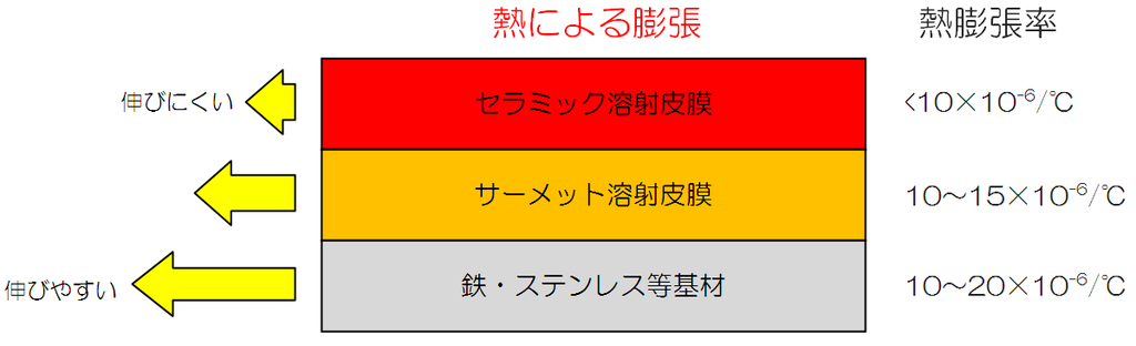 サーメットは金属とセラミックの中間の熱膨張率を持ち、熱サイクルによる破壊を緩和する効果があります。また、サーメットは耐高温酸化性に優れますので、基材の高温酸化を抑えることも可能です。